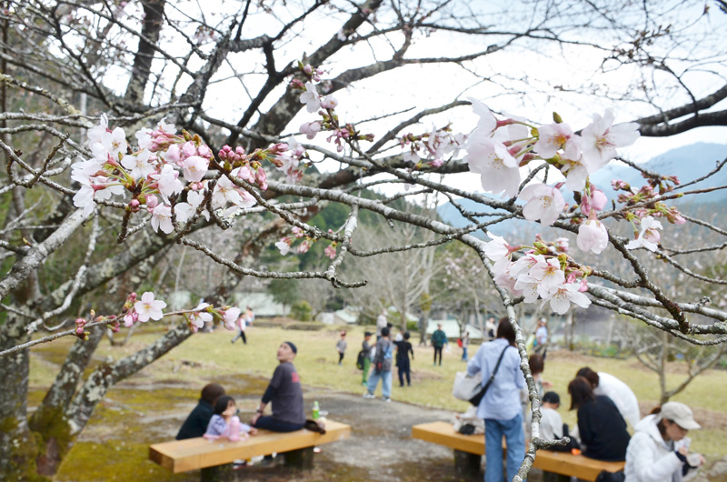 なお、会場に隣接する園地「薬草薬木園」はサクラが2分咲き程度になっていた。2月にベンチが寄贈されたこともあり、花見をしながら昼食を取る来場者が多く見られた。